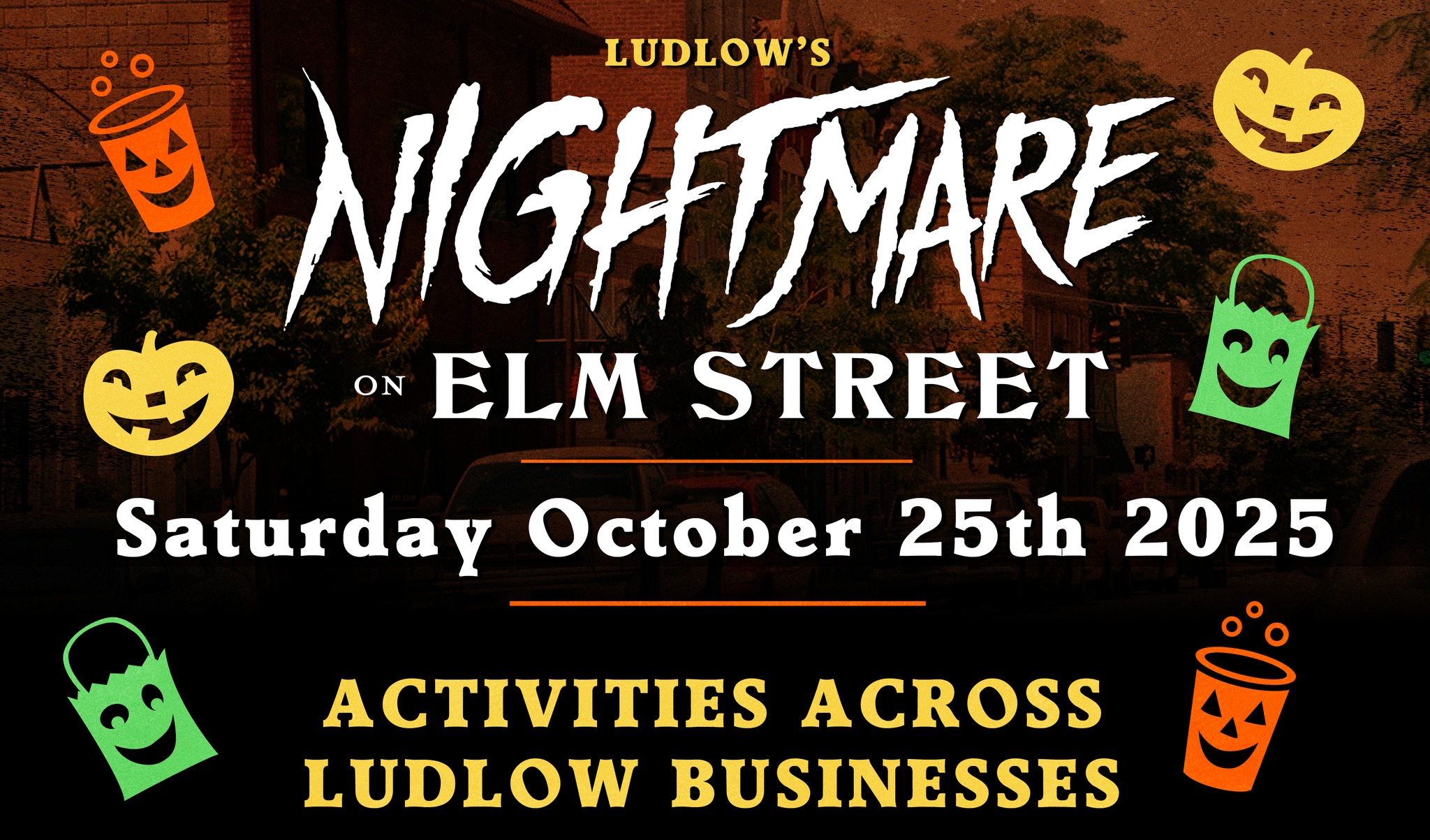 October brings you Ludlow's SECOND ANNUAL 2025 NIGHTMARE on Elm Street! Come have fun in Historic Ludlow with businesses offering up a myriad of activities from the morning into the late night! Various venues will feature