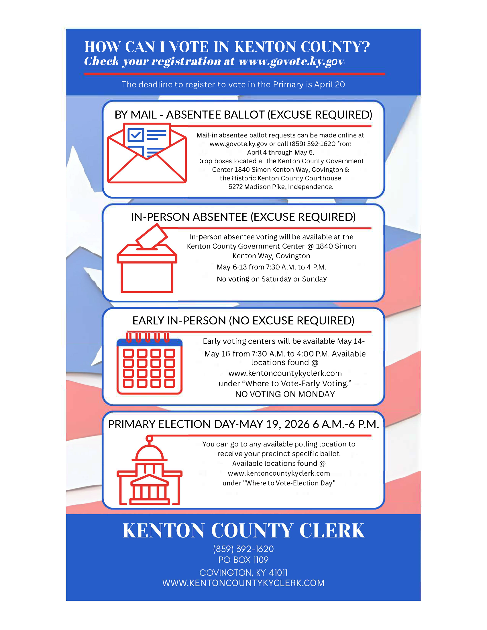 Below is voter information for the May Primary Election provided to the City by the Kenton County Clerk's office. Click HERE to visit their website for more information.